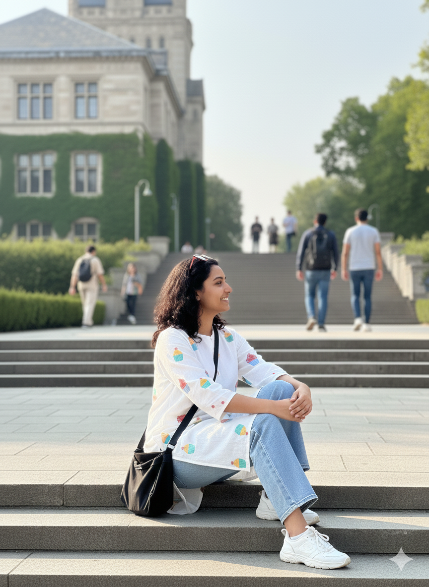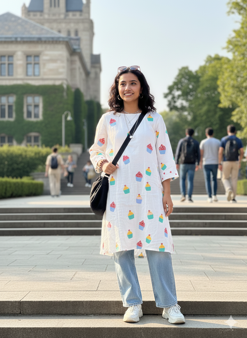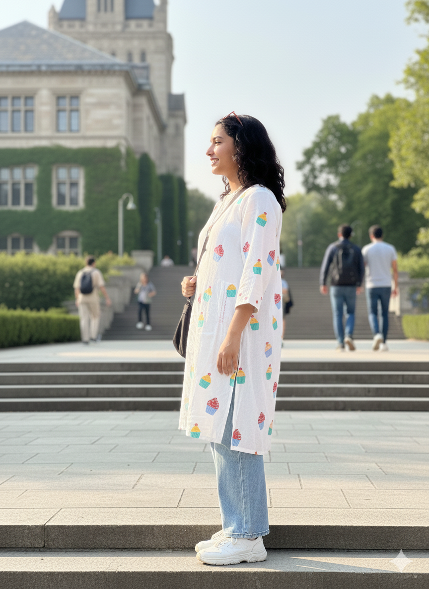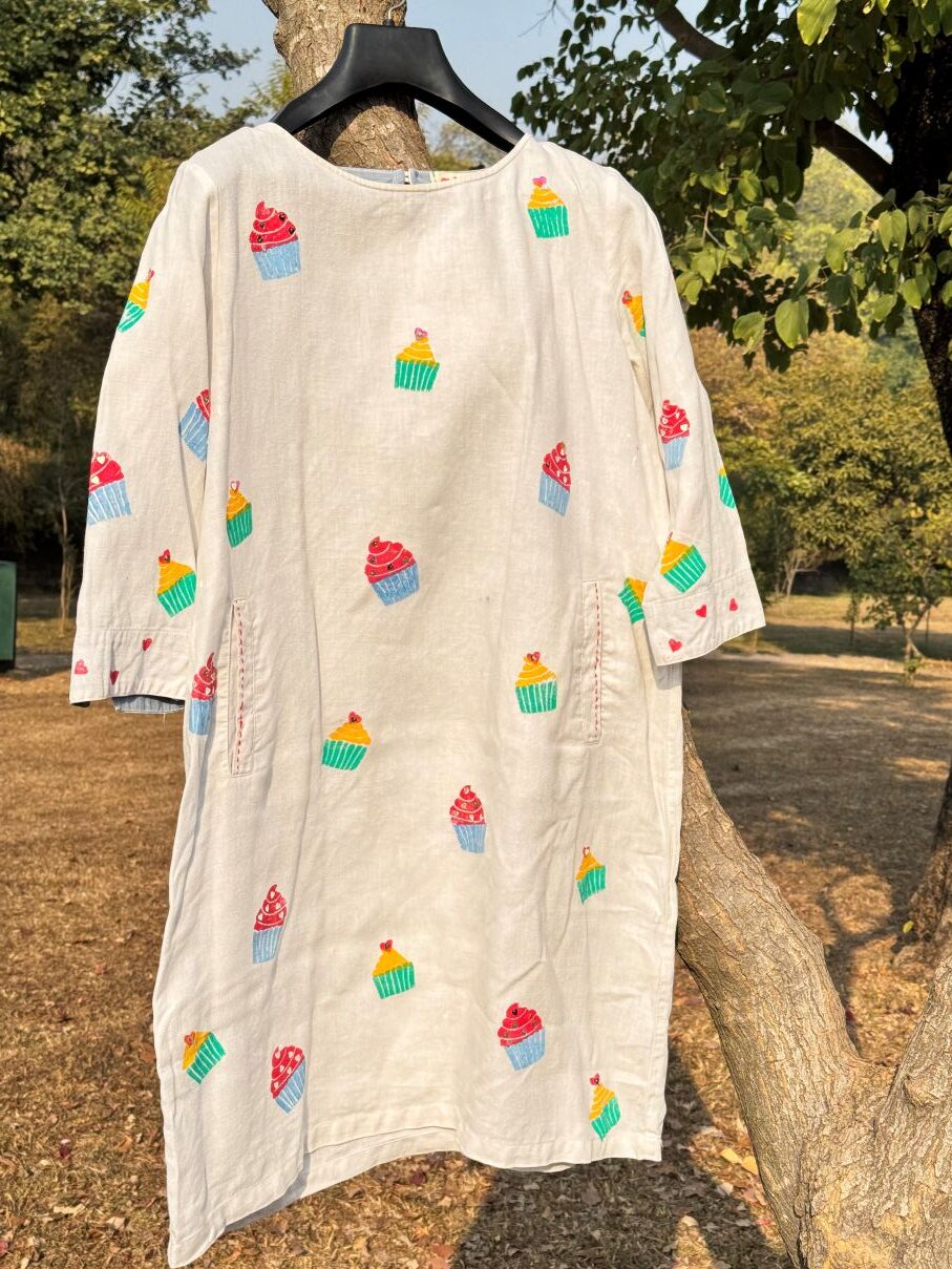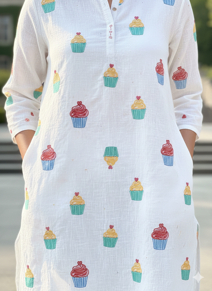Cupcake Delight – Hand Block Printed Kurta: A white hand block printed kurta with colorful cupcake motifs for a cheerful, fun-loving vibe. Custom measurements available.