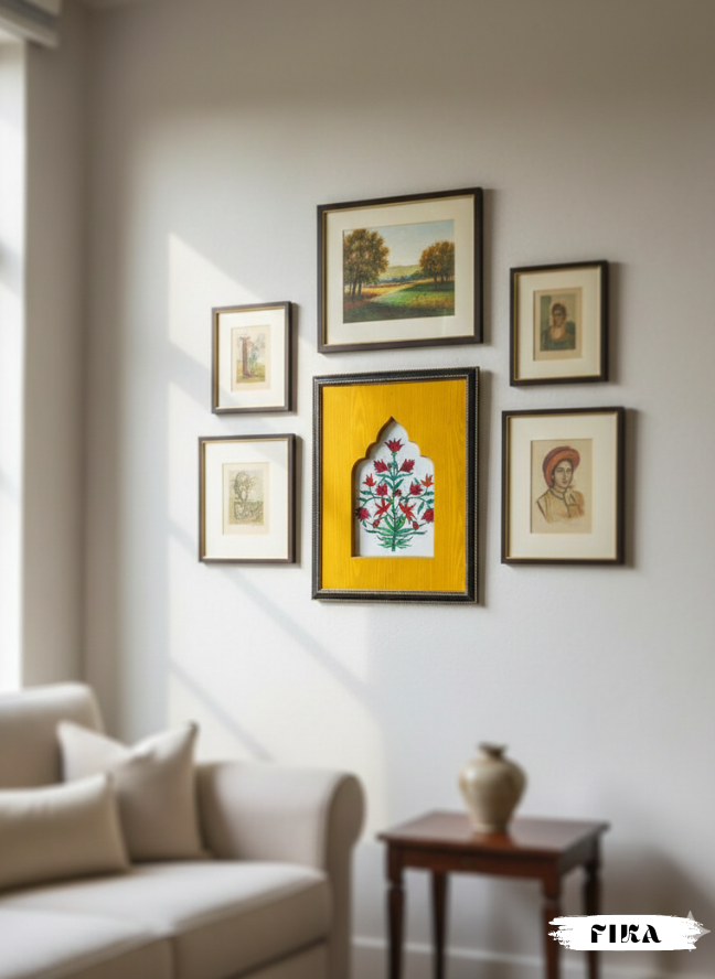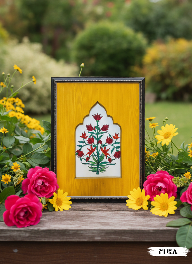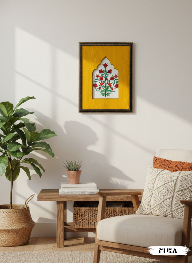 Heritage Floral Jharoka Painting draws inspiration from Mughal architecture, featuring intricate floral motifs framed within a classic jharoka cut.