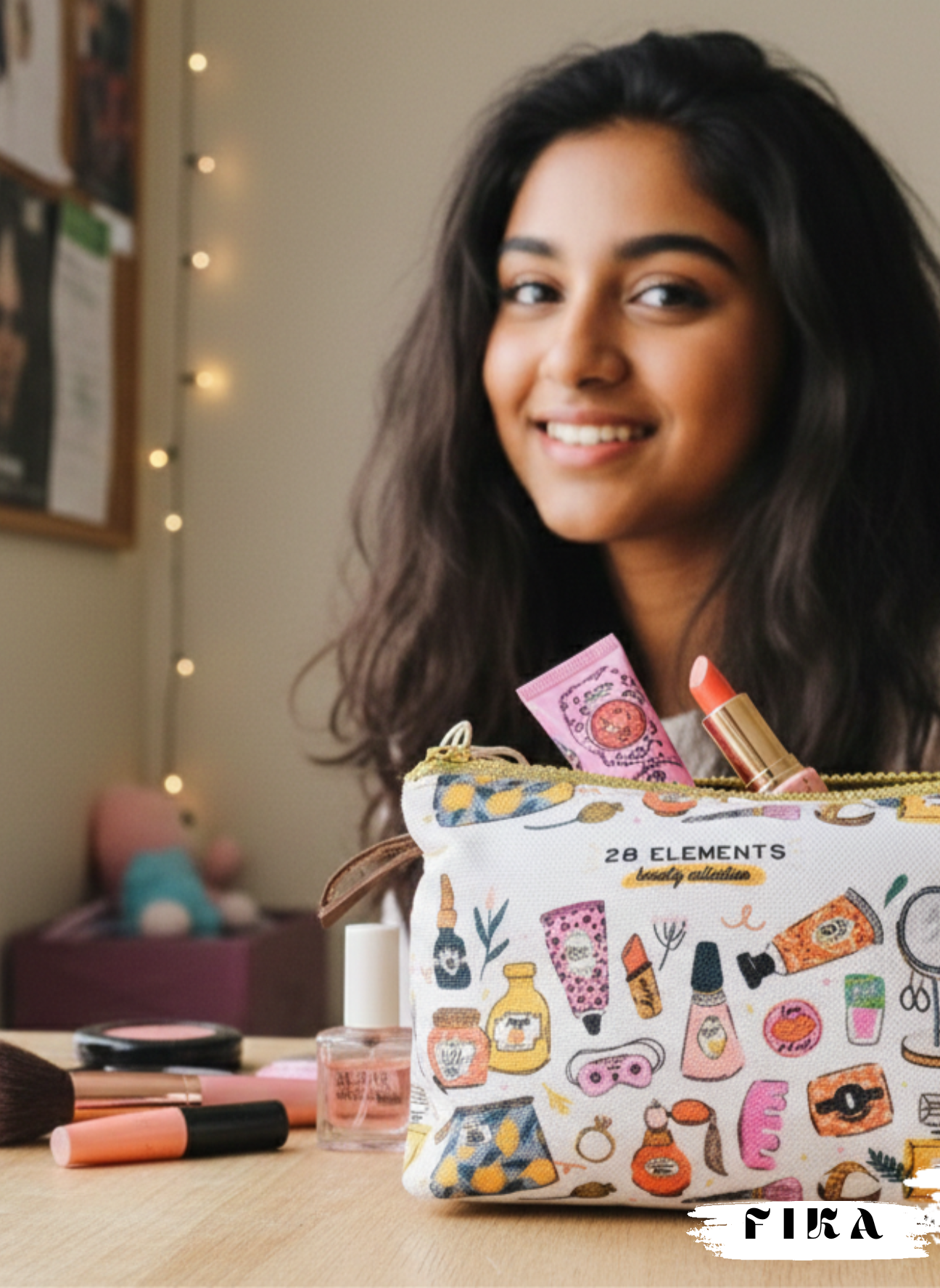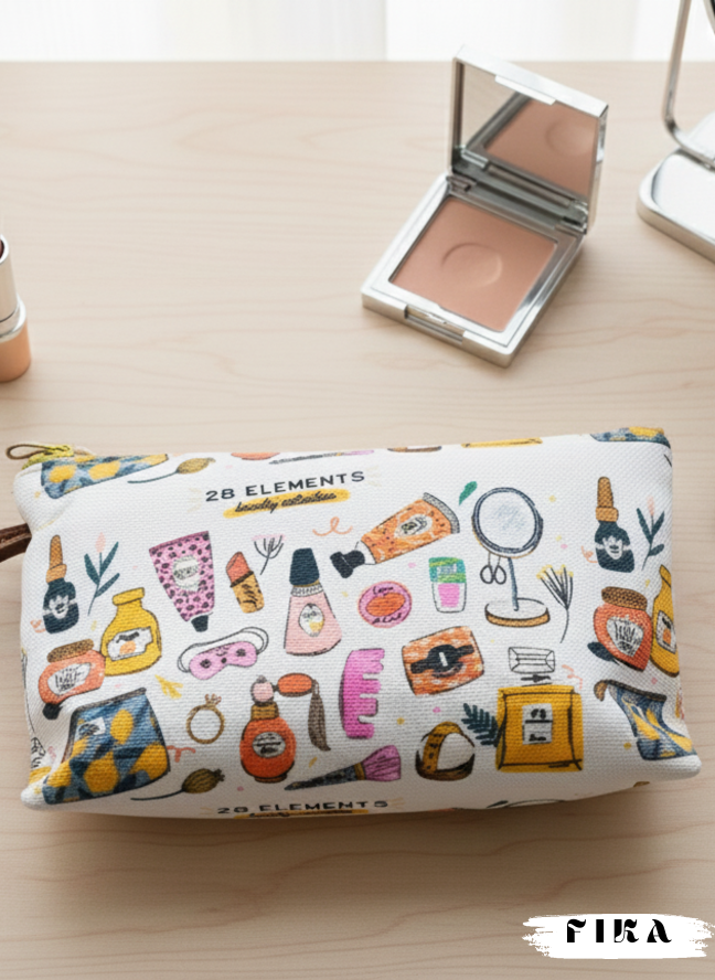 Makeup Element Pouch – a funky, colorful pouch with makeup-inspired prints. Spacious, stylish, and perfect to keep or gift.