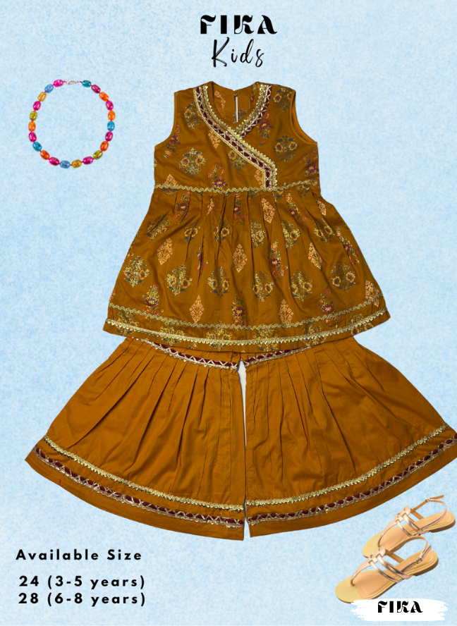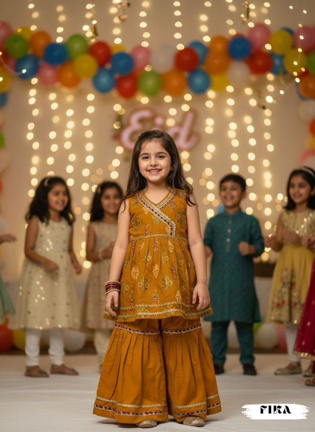 Add a touch of cultural grace to festive occasions with our Mustard Angrakha Sharara Set, a beautifully designed ensemble from FIKA Juniors.