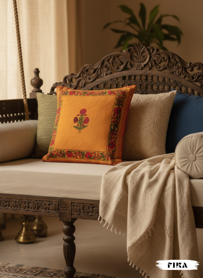 This Mustard Heritage Cushion Cover is a celebration of timeless craftsmanship. Carefully hand-block printed by skilled artisans, the design features a traditional floral motif framed by an intricate border that reflects heritage aesthetics.