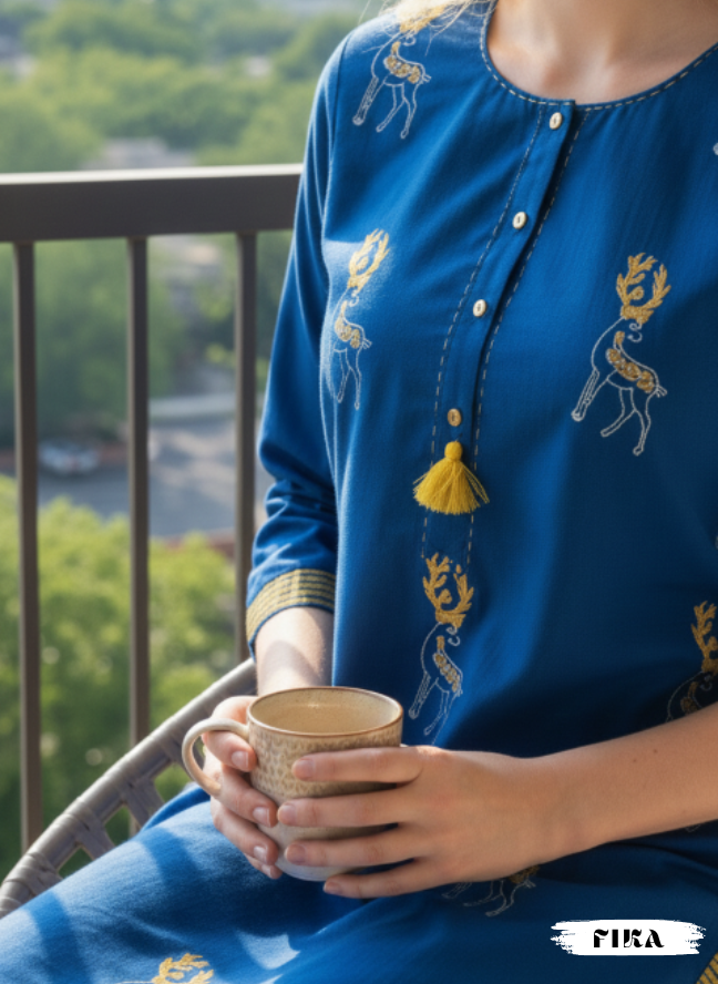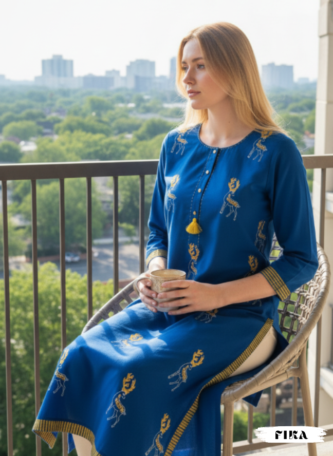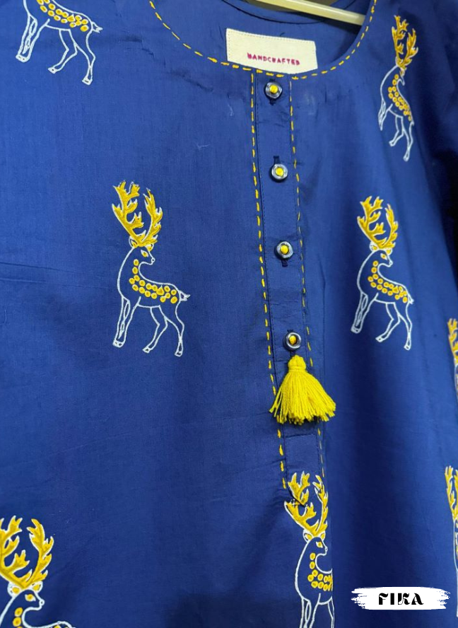 Hand block printed blue cotton kurta featuring elegant deer motifs. Ethically handcrafted, breathable fabric, and timeless design – perfect for everyday and casual wear.