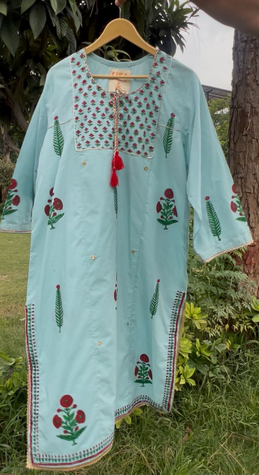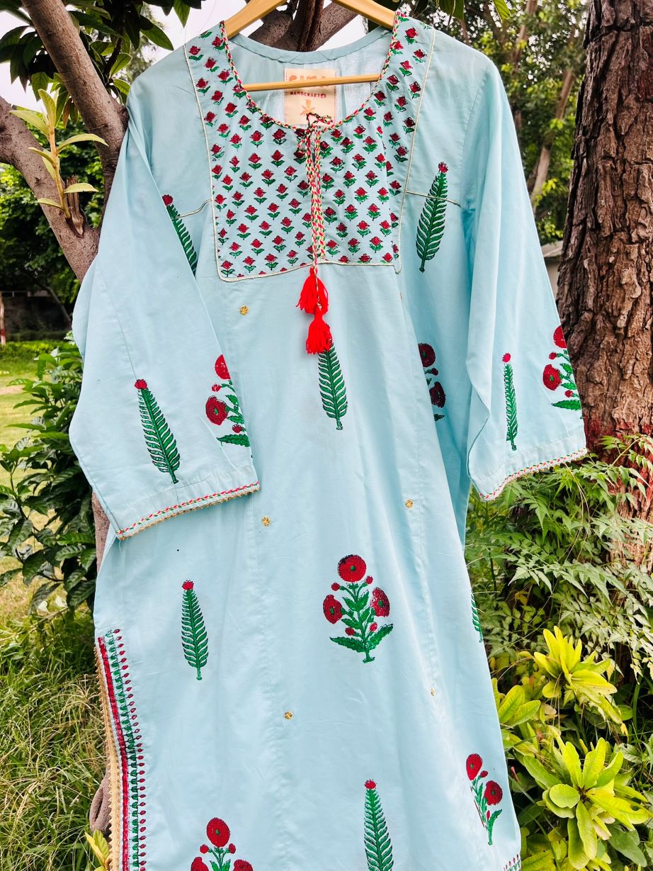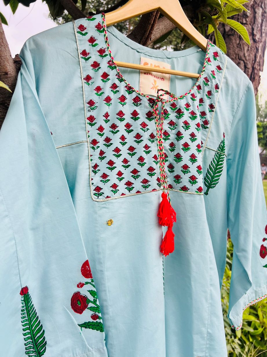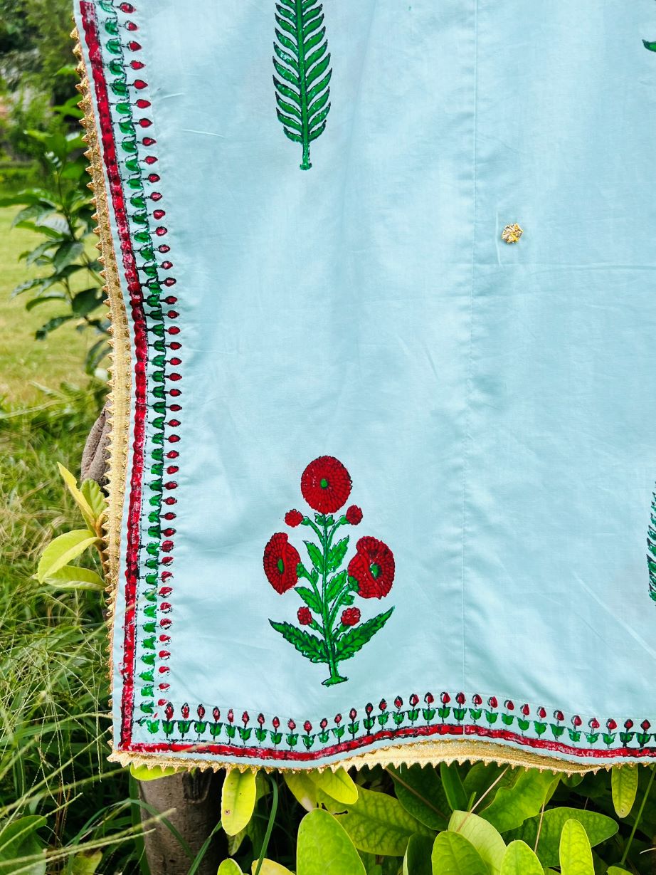 Sky Garden Handblock Set Pastel blue handblock printed A-line kurta with red and green floral motifs, golden lace detailing, and matching dupatta. Custom sizes via WhatsApp.