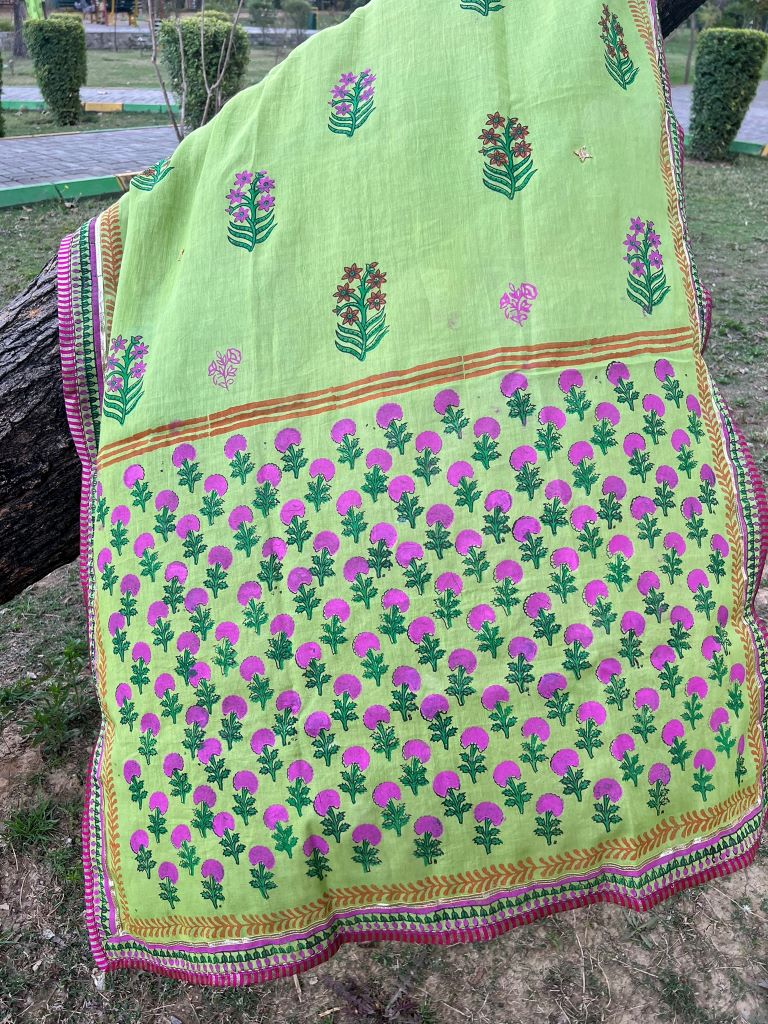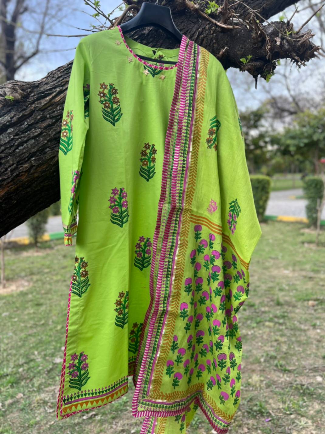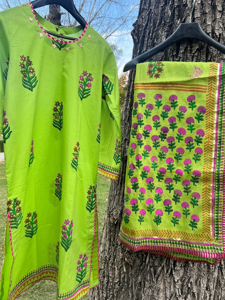 Spring Charm – Hand Block Printed 3Pc Suit: A stunning green 3Pc hand block printed suit, embellished with pink motifs and golden Tamba Gota. Paired with a matching dupatta, customizable for your perfect fit.