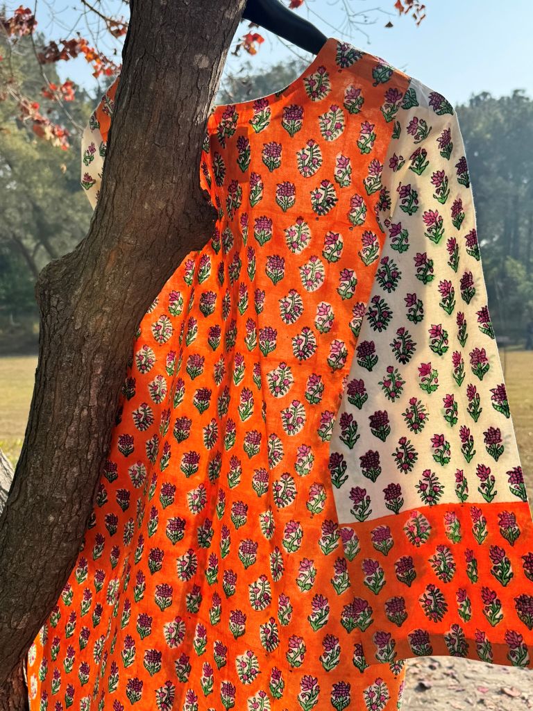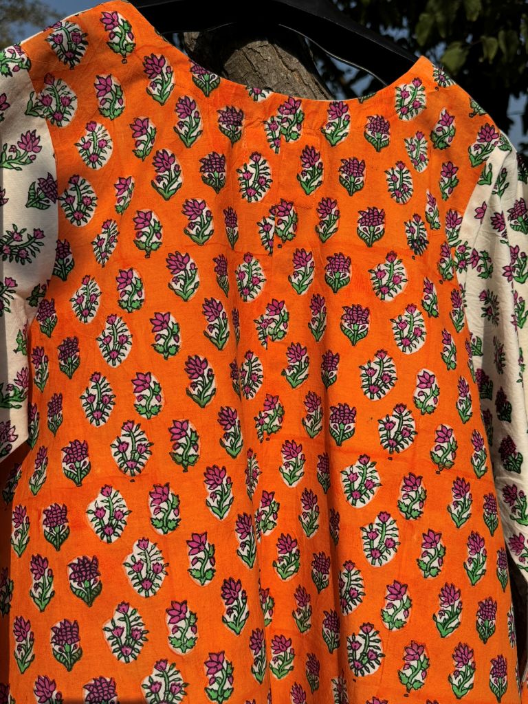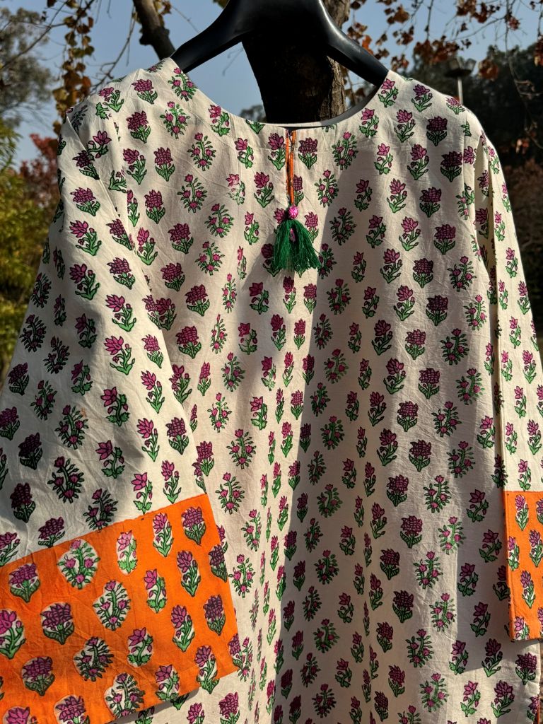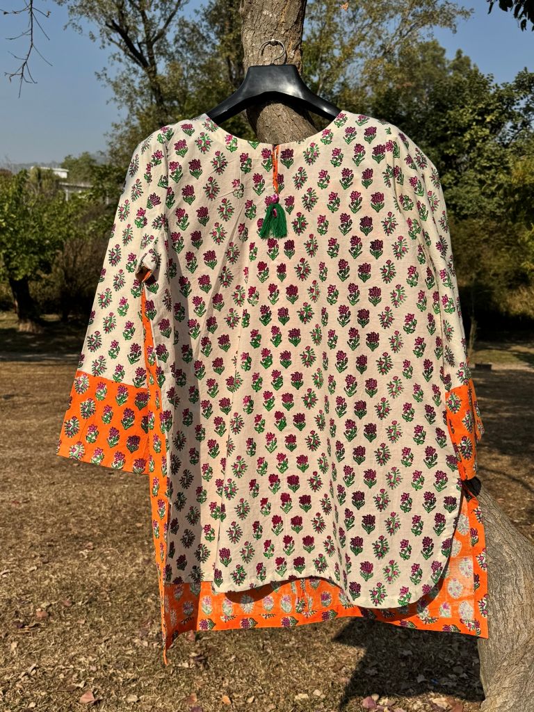 Urban Twist Kurta A trendy short kurta with orange & green hand block printed motifs on white, bold orange back, and stylish round cut.