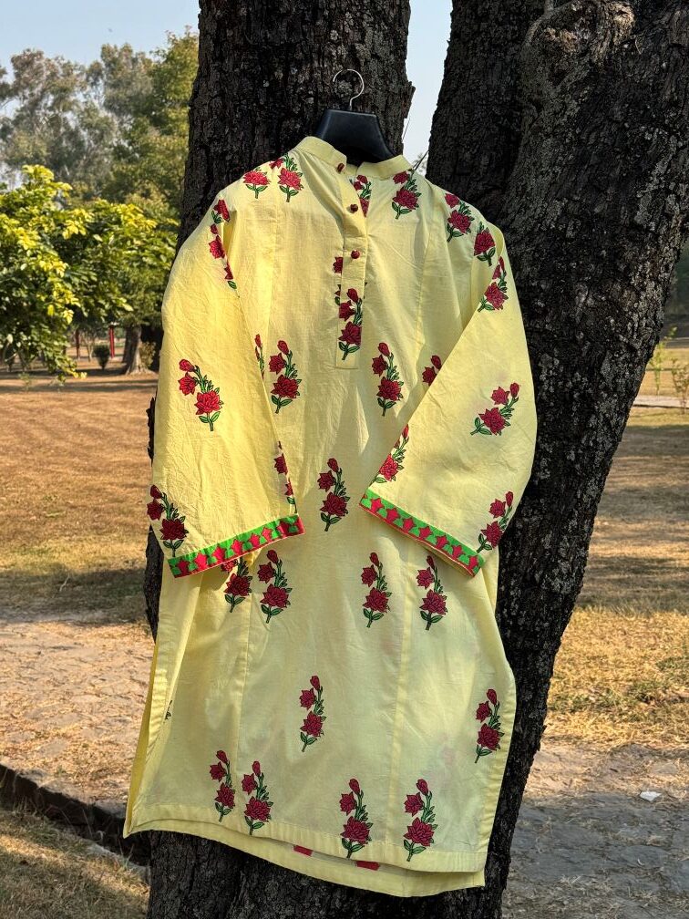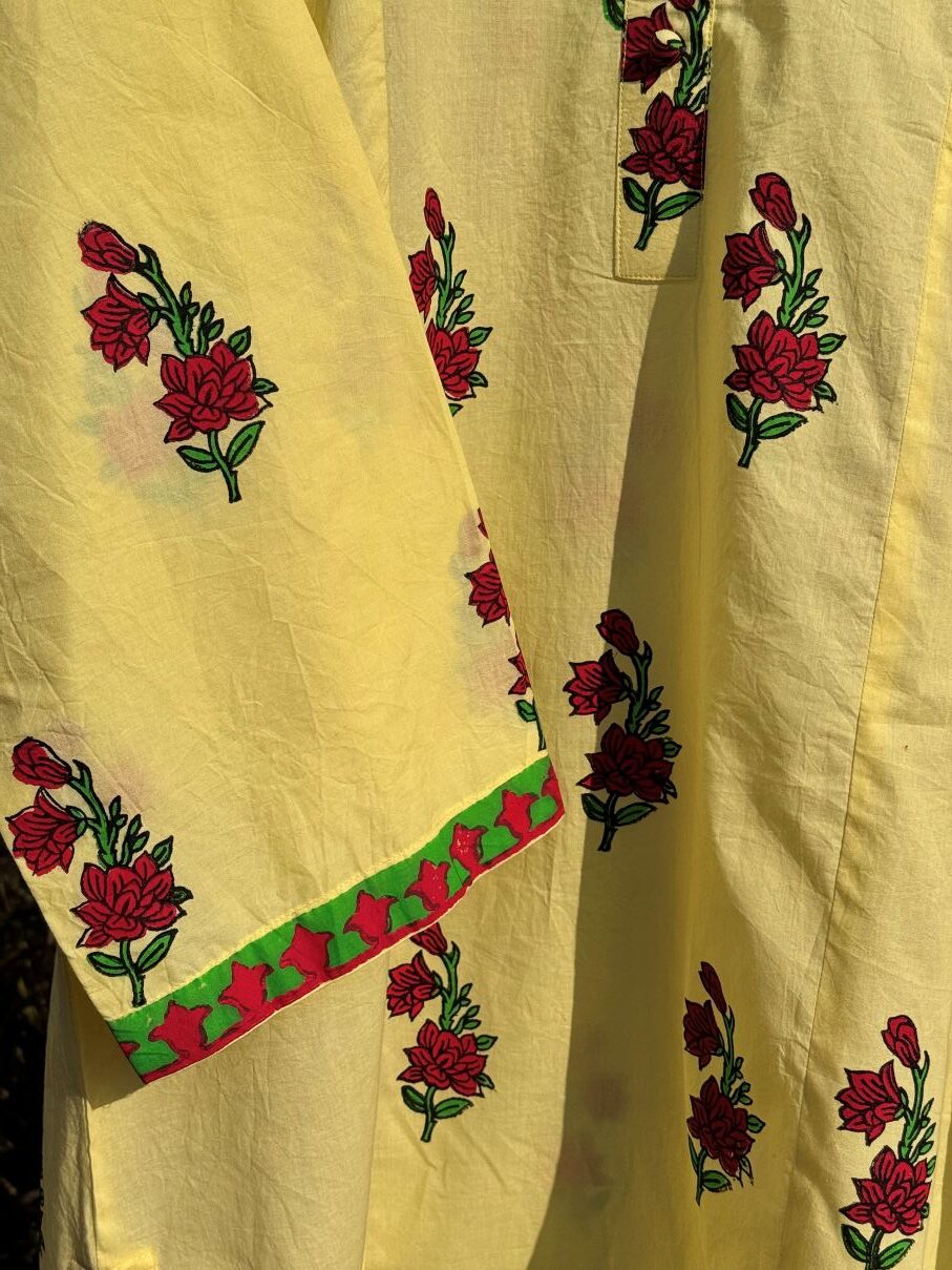 Radiate timeless charm with our Yellow Red Gold Hand Block Printed Cotton Kurta, featuring a yellow base adorned with red floral motifs and green leaves — a perfect blend of tradition and modern artistry.